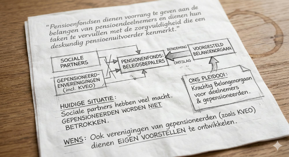 Wij pleiten daarom voor een belangenorgaan dat primair opkomt voor de belangen van pensioendeelnemers en gepensioneerden en bevoegdheden heeft tot benoeming en ontslag van de beleidsbepalers van een pensioenfonds. Op dit moment hebben vooral de sociale partners die macht. Inmiddels zijn de sociale partners en de pensioenfederatie al bezig met het ontwikkelen van plannen. De verenigingen van gepensioneerden zijn daar niet bij betrokken. Wij dringen erop aan dat ook de verenigingen van gepensioneerden, waaronder de KVEO, eigen voorstellen gaan ontwikkelen.
