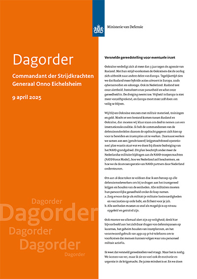 De Nederlandse krijgsmacht moet zich versneld in gereedheid brengen voor een eventuele inzet. Dat schrijft de hoogste militair van ons land, generaal Onno Eichelsheim, in een zogeheten 'dagorder' die gisteren is verspreid onder alle ruim 76.000 medewerkers van defensie, zowel militair als burgerpersoneel.