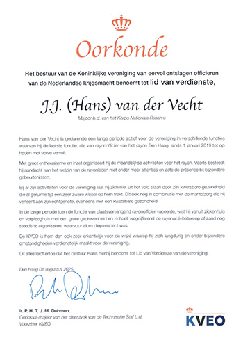Begin augustus van dit jaar is maj (R) b.d. Hans van der Vecht door het bestuur benoemd tot Lid van Verdienste van de vereniging.