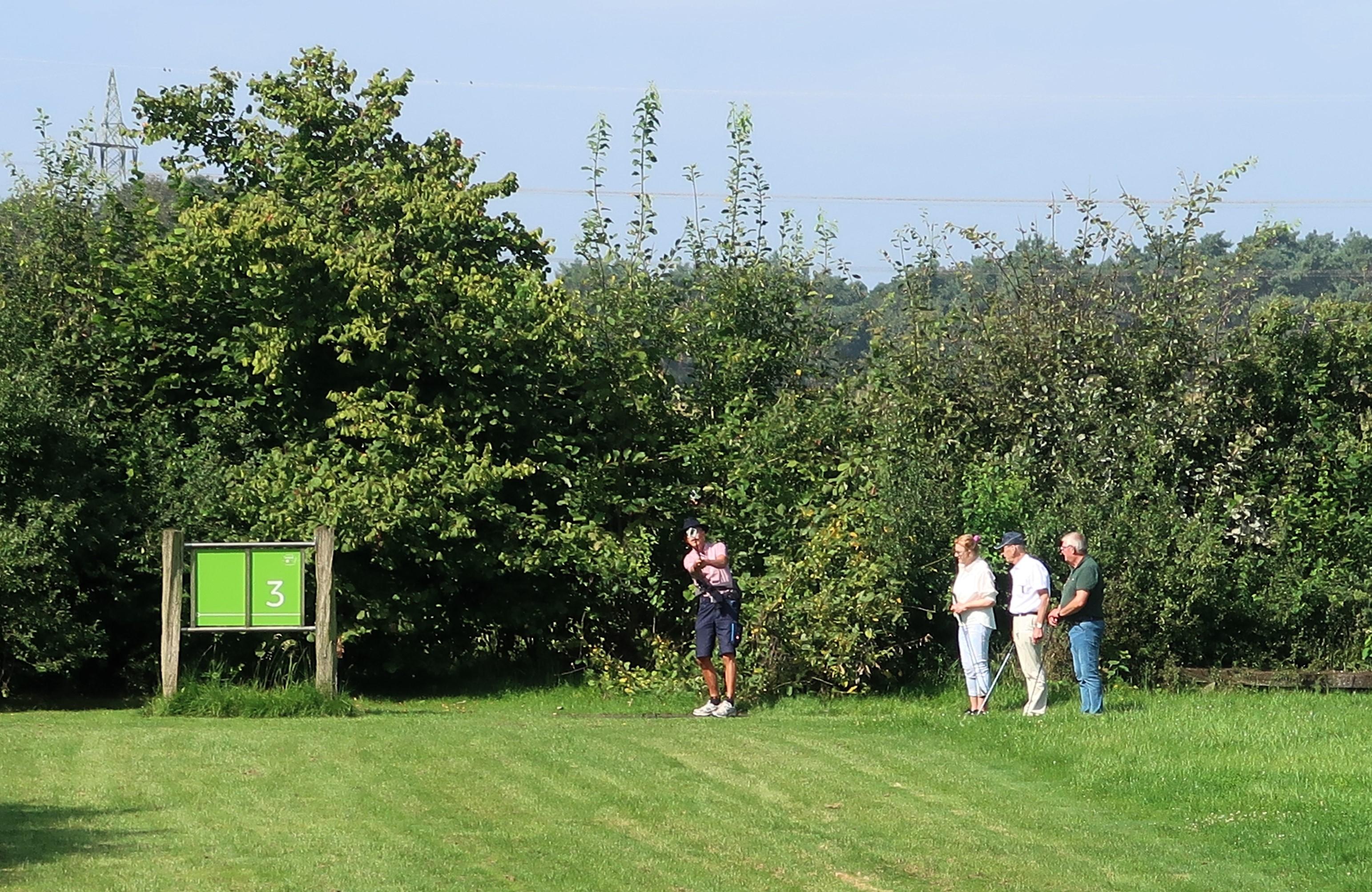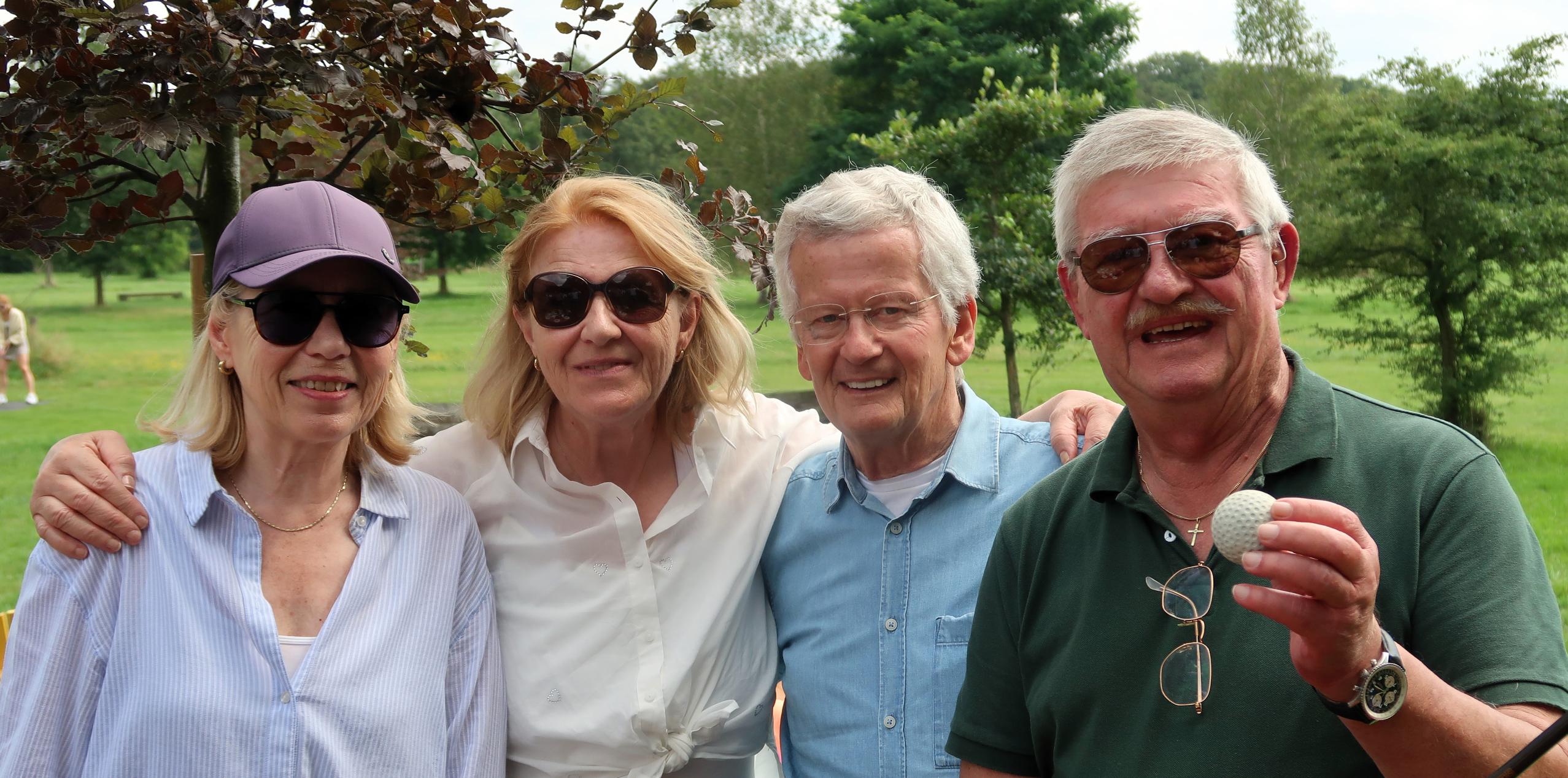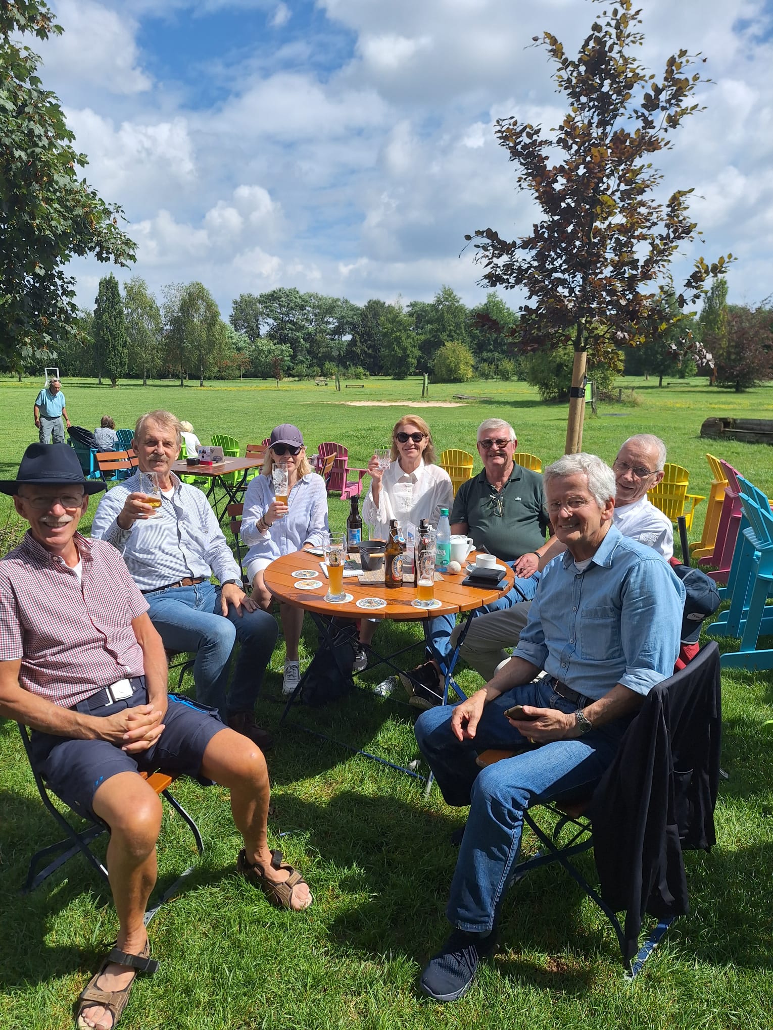 Na het ontbijt de volgende ochtend namen we afscheid van enkele leden en met het overige gezelschap togen we naar de golfbaan om een partij zgn swinggolf te spelen. Deze vorm van golf wordt met slechts één club gespeeld, op 18 holes, waarvan we er echter maar 9 hebben gedaan. Ook voor de golfspelers onder ons was het een hele uitdaging met maar één club ter beschikking en er ging ook nogal wat tijd zitten in het zoeken naar de bal in het hoge gras en tussen de struiken aan de zijkanten van de fairway. De ochtend en ook de bijeenkomst werd afgesloten met een drankje op het terras van het restaurant en met een 'tot volgend jaar' namen we afscheid van elkaar. Resumerend stel ik vast dat het een zeer geslaagde bijeenkomst was met een gevarieerd programma en veel blije mensen.